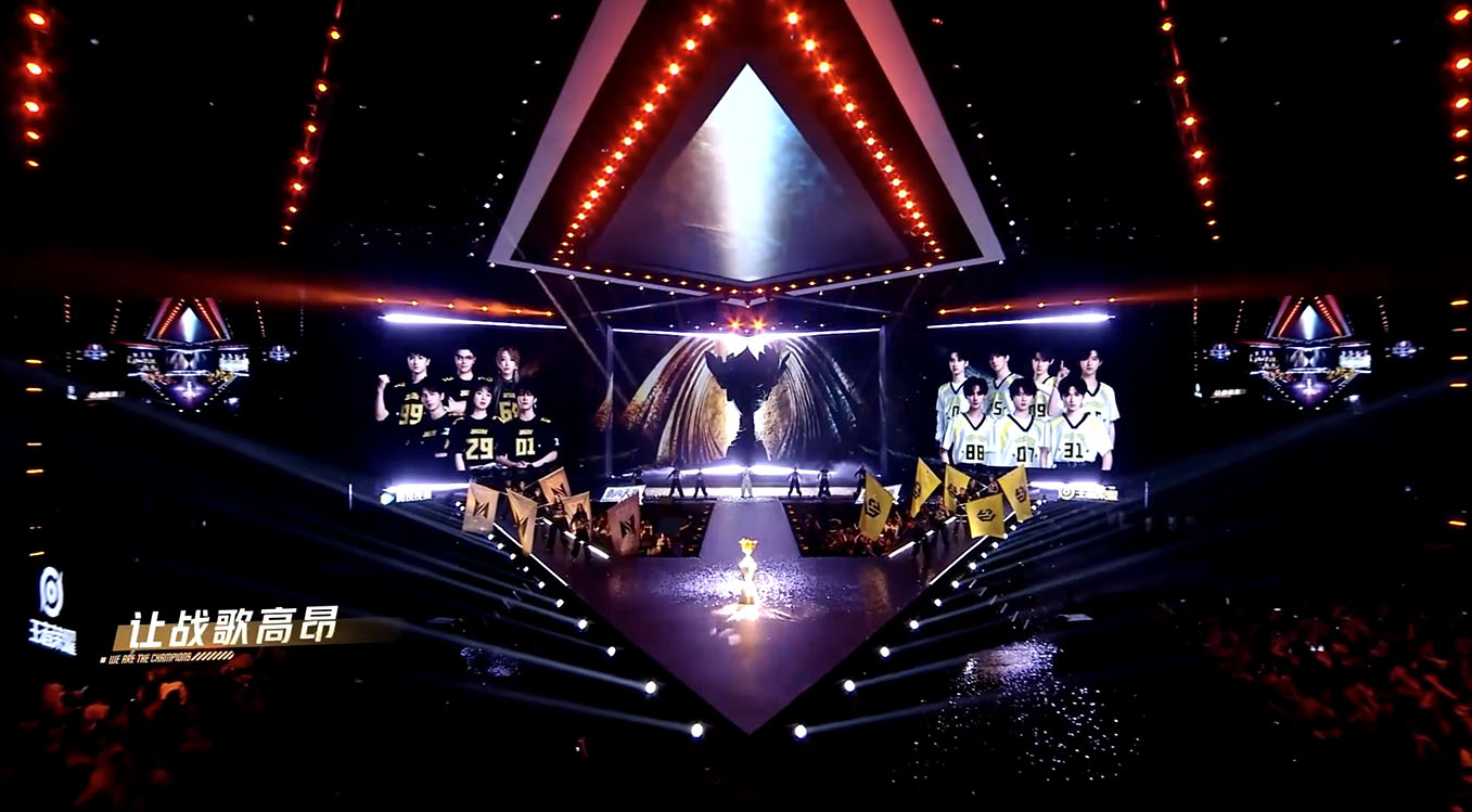 《战至巅峰》主题曲的视觉设计以火焰元素为核心,生动渲染出比赛现场的高燃情绪。宏伟的门与熊熊烈火交织,在开场瞬间点燃氛围;同时,夺冠场景被巧妙融入视觉结构中,突出赛事主题与竞技精神。奖杯背景运用双色光线形成鲜明对比,既呼应开场门的意象,又将现场高潮与阶段性落幕自然衔接,整体视觉节奏流畅,情绪贯穿始终。